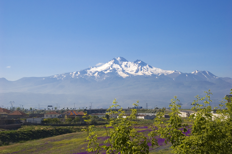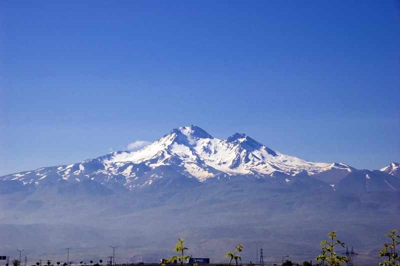 Kayseri’yi tam arkamızda bırakmak üzere iken, dün bütün gün bulutların içinde saklanan Erciyes Dağı solumuzda bize güzel görüntü verdiği için Kırşehir ayrımında yol kenarında durup birkaç resim çektik.