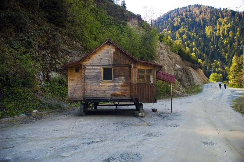 Yolda Karadeniz insanının doğasındaki yaratıcılığı bir kez daha gördük. Yolun kenarında altında çatısı kiremitli 4 adet tekerleği olan bir yayla evi duruyordu. Hatta kapısının önüne bile sundurma yapılmıştı.
