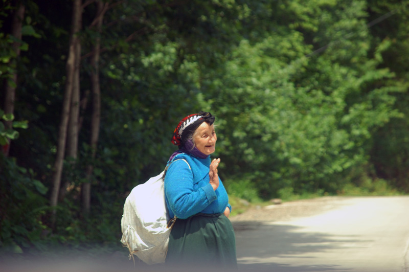 Zilkale’den dönüş yolumuzda, yaşlı bir teyzenin yolun kenarında sırtında heybesi ile yürüdüğünü görünce durduk. Teyzenin adı Fidan Duman’mış. Bahçede çalışmaktan dönüyormuş. Gideceği evinin yerini gösterince hayrete düştük. Evi yukarıda da anlattığım gibi yamaçtakilerden biriydi. Oldukça güleç yüzlü ve hoş sohbet bir teyzeydi. Ülgen ve Gülay’la 10 dakikalık bir sohbette hayat hakkında ufacık dersleri de araya sıkıştırdı. Uzaktan birkaç fotoğrafını çektik ve videoya aldık.