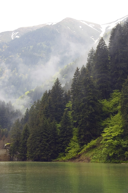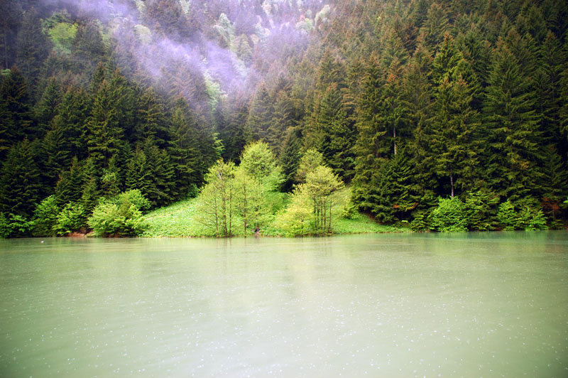 Manzara Şelelesi’nden sonra köyün içinden geçerek, gölün güney ucunda yer alan bentlere gidildi. Burada da yağan yağmurdan korunmak için açtığımız şemsiyenin altından inanılmaz güzel görüntüler yakaladık. Bentlerin bulunduğu vadinin ilerisinde yine Kaçkarlar’ın karlı ve sisli tepeleri karşımızdaydı.
