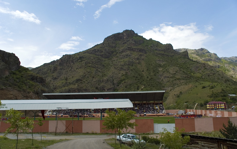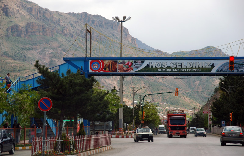 Mağaradan hareket edip, anayola çıktıktan 12 km kadar sonra Gümüşhane’ye ulaştık. Trabzon yolundan Gümüşhane’ye geldiğinizde ilk olarak Gümüşhane Şehir Stadyumu ile karşılaşıyorsunuz. Stad oldukça ilginç bir yere kurulmuş. Tribünün bir kısmı kayaların arasına, toprak ve kayaların oyulması suretiyle yapılmış. Stadyumda rengarenk giyinmiş olan öğrencilerin 19 Mayıs gösterileri vardı. Kısa bir süre seyrettikten sonra Gümüşhane’nin içinden geçerek yolumuza devam ettik.