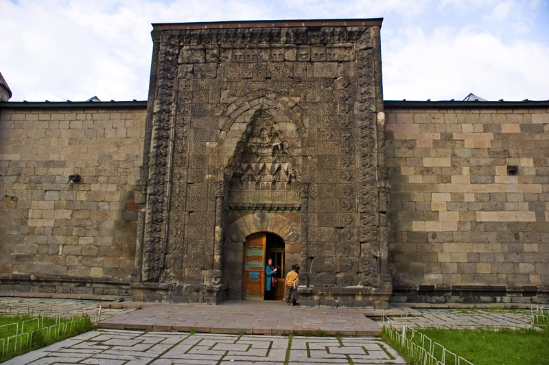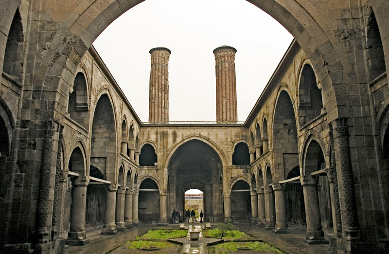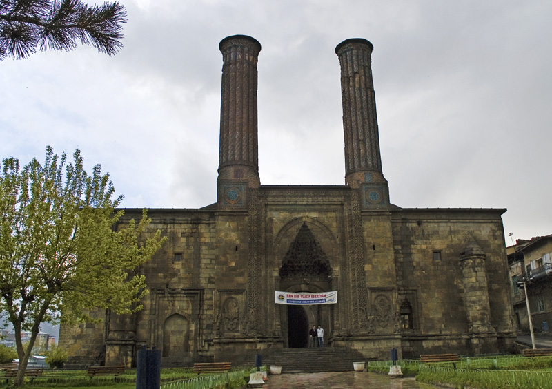 Erzurum’un sembolü haline gelen Çifte Minareli Medrese’nin 13.YY. sonlarında yapıldığı tahmin ediliyormuş. Selçuklu Sultanı Alaaddin Keykubat’ın kızı Hundi Hatun veya İlhanlı hanedanlarından Padisah Hatun tarafindan yaptırılmış olabileceği düşüncesi ile adına Hatuniye Medresesi de deniliyormuş. Osmanli Padisahlarından 4.Murat’in emri ile bir süre Tophane olarak, daha sonra da Kışla olarak kullanılmış. 35 m x 46 m boyutlarında olan medresenin zemin katında 20, birinci katında ise 22 oda bulunuyor. Medresenin ortasındaki avlu, dört taraftan revaklarla çevrili olup, revaklar dördü sekizgen gövdeli, diğerleri silindirik kalın sütunlar üzerine oturtulmuş. Medresenin, süslemelerle bezenmiş olan taç kapısının her iki yanında payandalar üzerinde yükselen iki minaresi ile Anadolu Osmanlı mimarisinde önemli bir yeri bulunuyor. Sırlı tuğladan yapılmış olan minareler, kalın yivli olup, yer yer aralarına üçgen çiniler yerleştirilmiş.