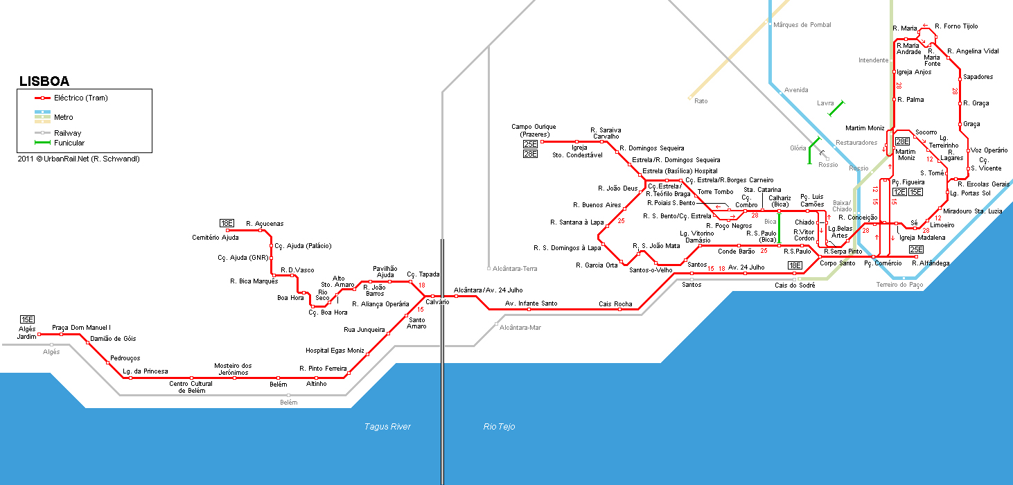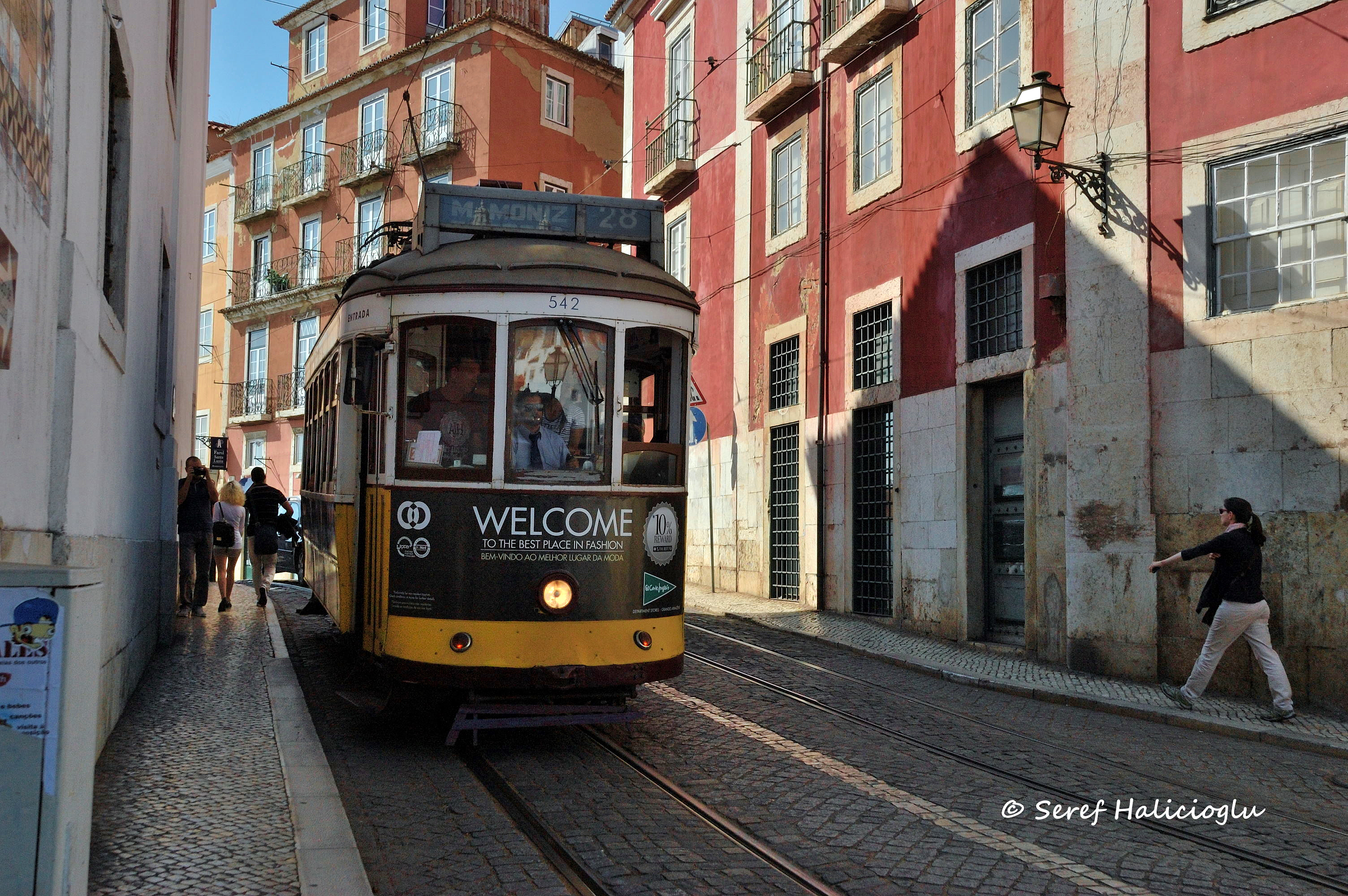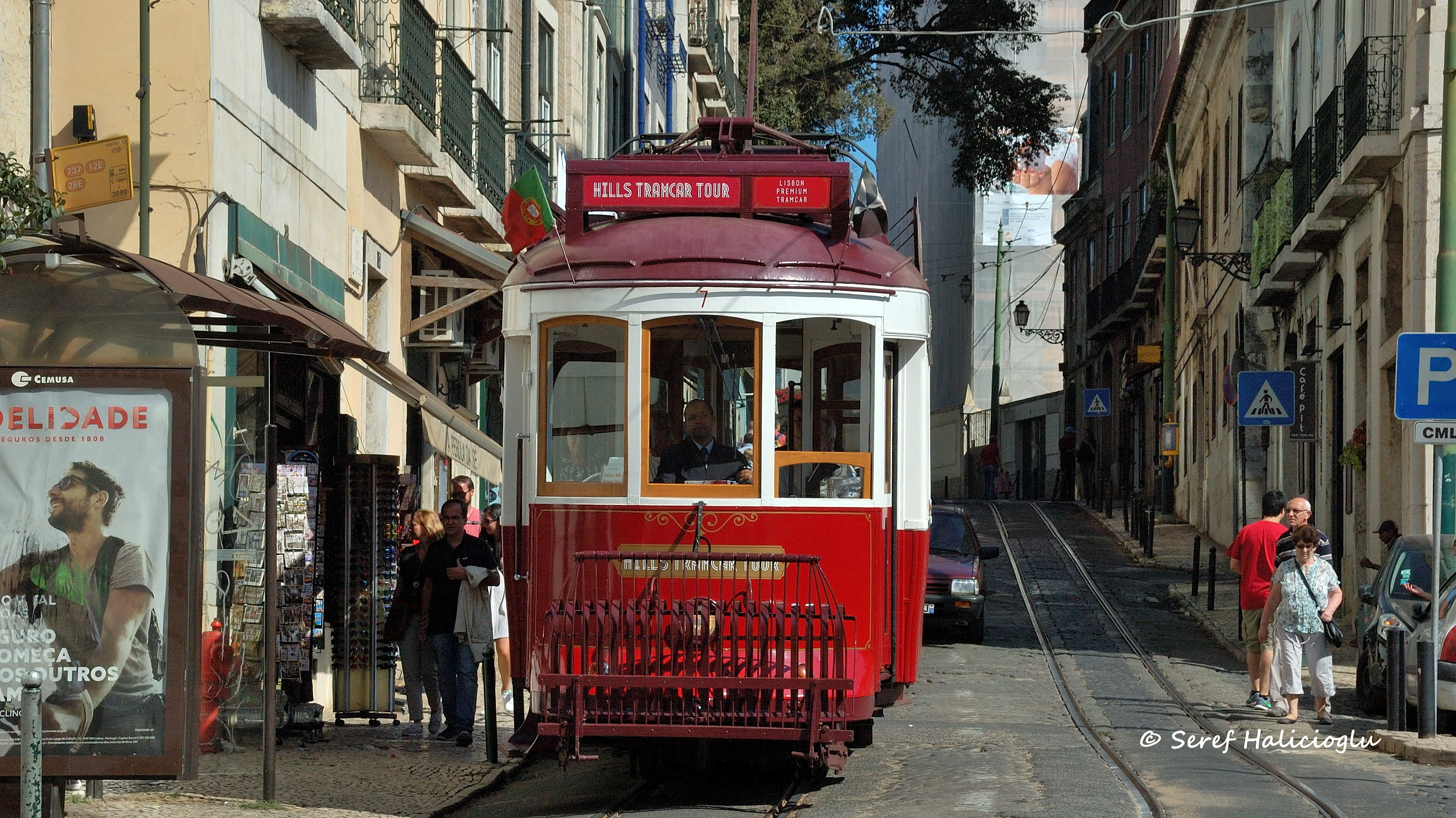 Oldukça inişli ve çıkışlı bir yer olan ve yokuş yukarı yürümenin, özellikle ileri yaşta olan veya yürüme zorluğu bulunan insanlar için oldukça zor olduğu Lizbon’da, şehir içi ulaşım için en iyi yol, tramvayları kullanmaktır. Lizbon’da tramvay hattının ilk temelleri 1873 yılında atılmış ve başlangıçta at arabaları kullanılmış. 1901 yılında tramvay hatları elektrikli hale getirilmiş. Bu nedenle de Lizbon tramvay hatlarına “eléctrico” anlamına gelen E harfi ile başlayan bir numara veriliyor. Halen toplam 48 km’lik bir mesafede çalışan 58 tramvay bulunan beş tramvay hattı var. E28, E12, E15, E18 ve E25. Bunlardan en ünlüsü 28 no’lu tramvay olup, bununla ilgili bilgilere yukarıda yer vermiştim. Diğerlerinden E12 , Alfama üzerindeki E28 yolunun çoğunu izlemekte, ancak çok sınırlı bir hizmet sunmaktadır. E15 hattı ile, Lizbon merkezden batısındaki Alges’e ulaşılmakta olup, Belém’e gitmek için en iyi alternatiftir. E25 ve E28 hatları ise şehir merkezinden turistik bölgeler dışındaki Lizbon semtlerini kapsamaktadır. Ayrıca sadece turistlere hizmet veren ve Alfama bölgesinde çalışan kırmızı ve yeşil renkli tramvay hatları da bulunmaktadır. Lizbon’daki tüm tramvay hatlarının haritasına aşağıda yer verilmiştir.