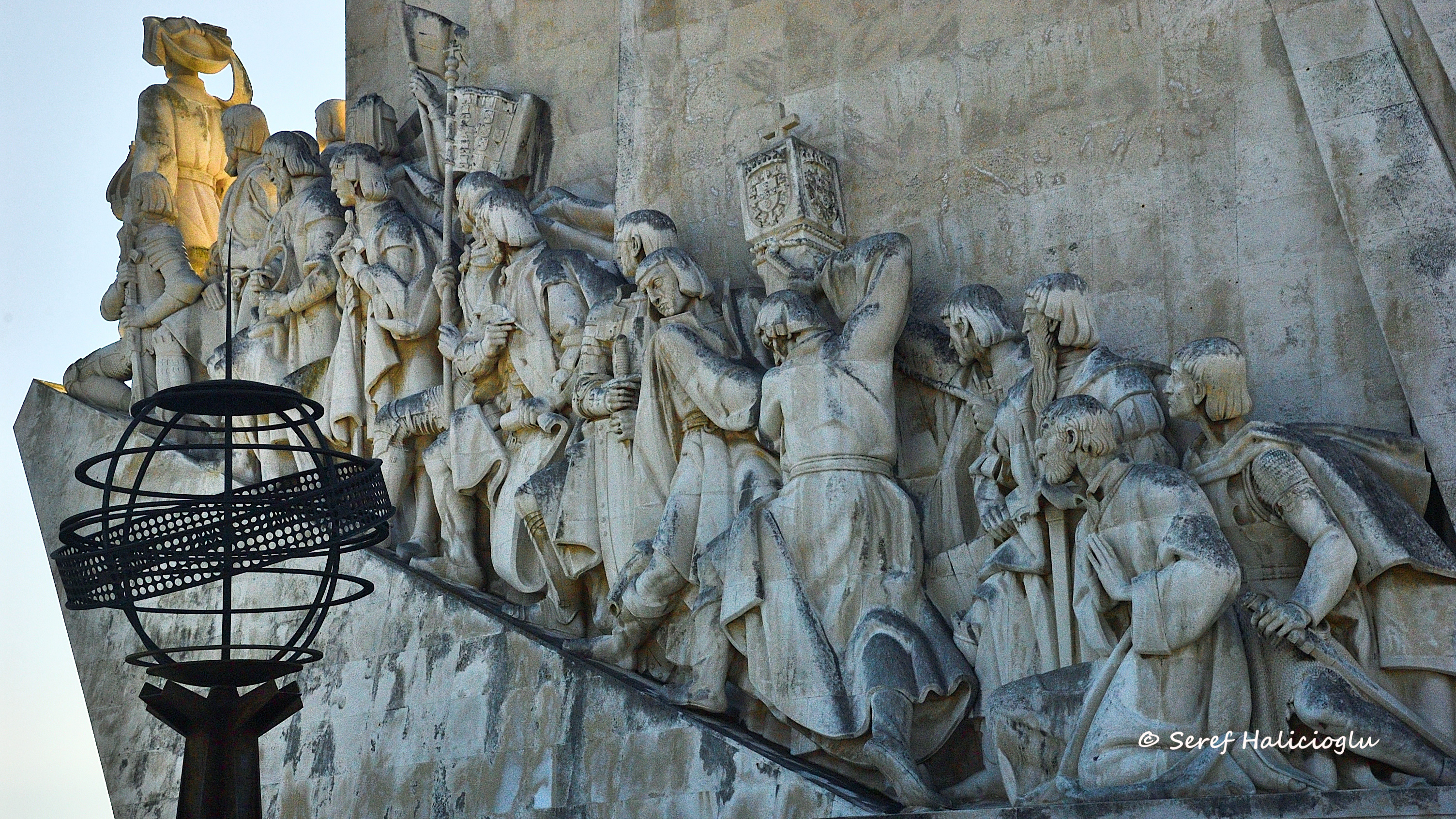 Coğrafi keşiflerin ilk zamanlarında Portekizli denizcilerin kullandığı yelkenli karavellerden esinlenerek yapılan anıt, bir gemiyi sembolize etmekte ve her iki tarafındaki pruvasında Portekiz Coğrafi Keşifleri ile bağlantılı önemli kişiler betimlenmiştir. Her bir pruvada 16 şardan toplam 32 kişiye yer verilmiş olup, en önde ise elinde bir karavel tutarak bilinmeyen denizlere bakan Infante Dom Henrique görülmektedir.