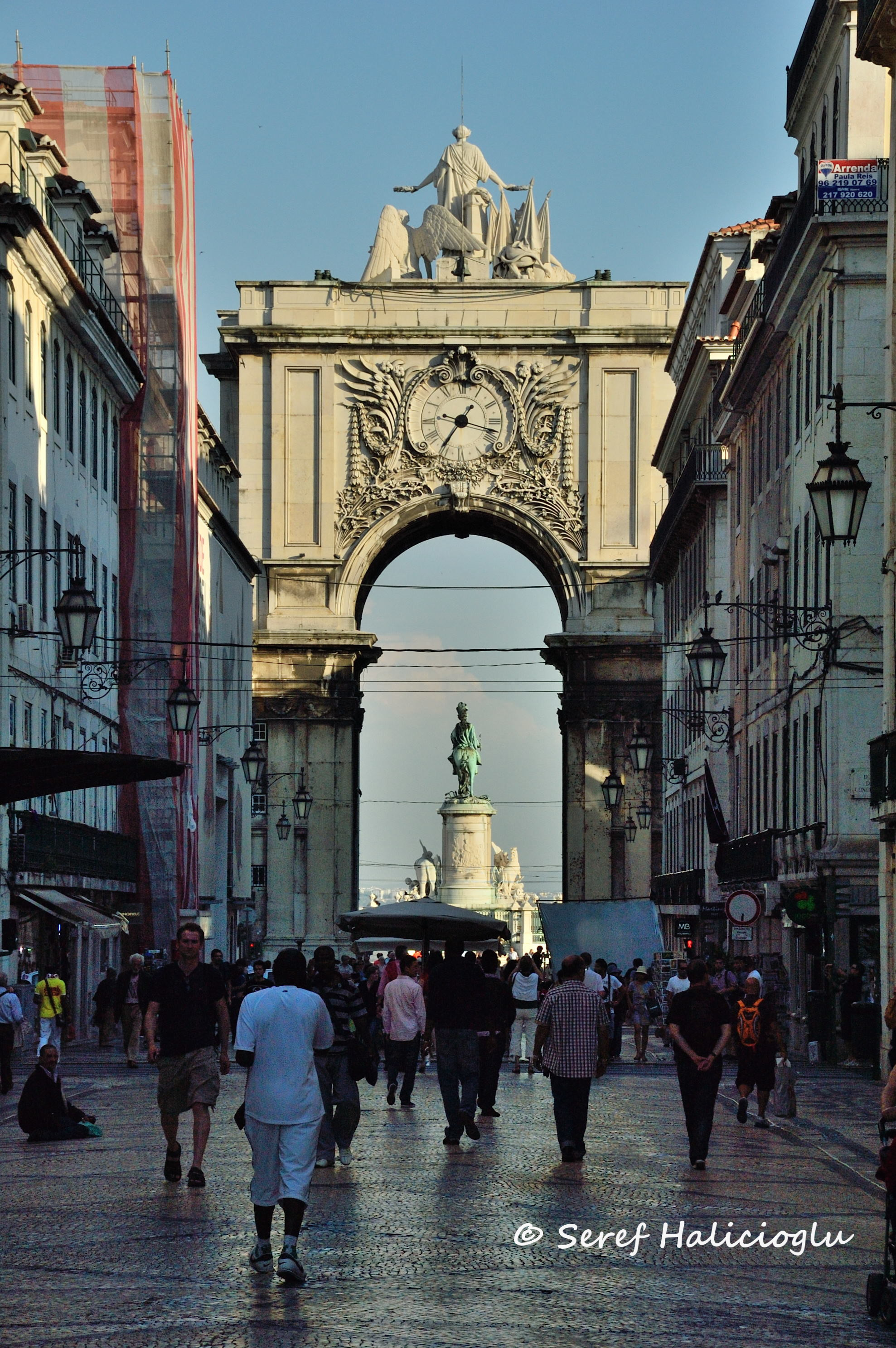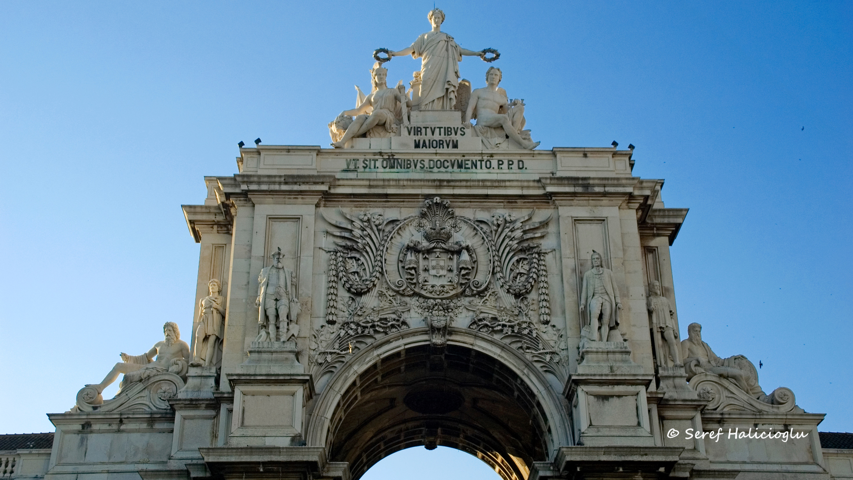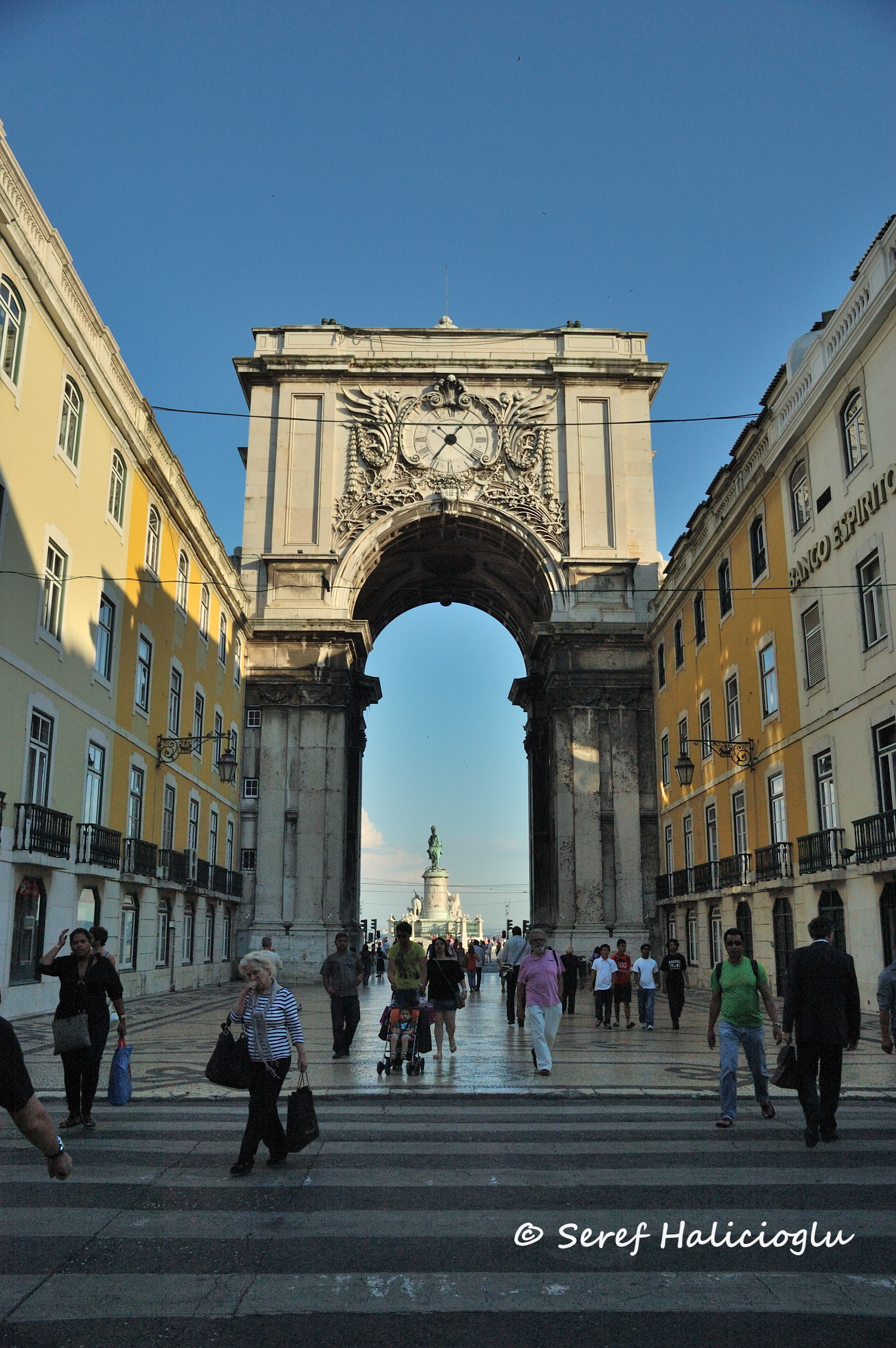 Baixa ve Lizbon’un ana caddesi olan Rua Augusta’nın Praça do Comércio’ya açılan kapısı olarak da görülebilecek olan Rua Augusta Takı, 1755 depreminden sonra şehrin küllerinden doğuşu zaferini onurlandırmak için Neo-Klasik tarzda 1875 yılında yapılmıştır. Takın üst kısmında Celestin Anatole Calmels tarfından yapılan heykellerde, Zafer tarafından taçlandırılan Kahramanlık ve Yaratıcılık anlatılıyor . Alt kısımda ise ünlü kaşif Vasco Da Gama, Lisbon’un deprem sonrası mimarı Marquês de Pombal, askeri deha olarak kabul edilen Nuno Alvares Pereira ve M.Ö.1.yy da Roma İşgali’ne karşı direnen Lusitania’lıların lideri Viriato’nun, Victor Bastos tarafından yapılan heykelleri yer almaktadır. Takın her iki yanında yer alan yarı uzanmış haldeki heykellerden sağdaki Douro nehrini, soldaki ise Tagus (Tejo) nehrini simgeler. Proje aşamasında çan kulesi olarak tasarlanmış ise de daha sonra yapım aşamasında tak şekline dönüştürülmüştür. Takın altındaki “VIRTVTIBVS MAIORVM VT SIT OMNIBVS DOCVMENTO” yazısı “Büyüklerimizin erdemleri hepimize yol gösterir.” anlamındadır. Lizbon kartpostallarında en fazla yer alan kemerin, gerek Rua Augusta’dan, gerekse Praça do Comércio’dan etkileyici bir görünüşü vardır.