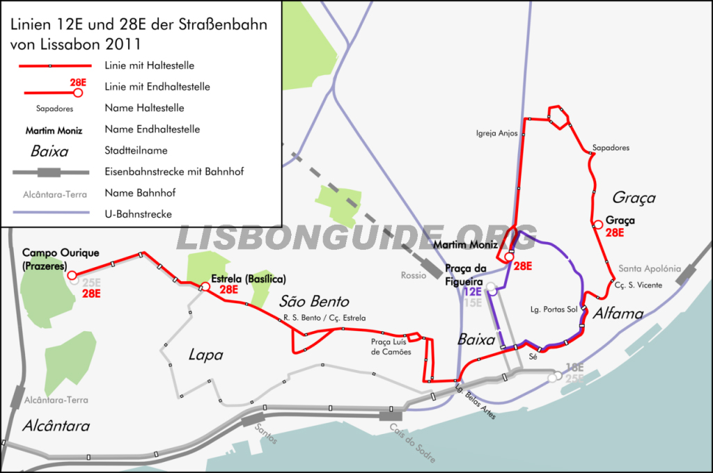 1914 yılında açılan Lizbon’un bu ikonik tramway hattı, şehrin eski bölgeleri ve tarihi yerlerini dolaşmak için en iyi alternatiftir. ve Praça Martim Moniz’den başlar,şehrin eski mahalleleri Mouraria, Alfama, Baixa, Chiado ve Estralla’dan geçerek Campo Ourique (Prazeres)’den ‘den geri döner. 15 dakika aralıklarla hareket eder ve toplam 7 km lik yolculuk trafiğe bağlı olarak yaklaşık 40 dakika kadar sürer. Toplam 34 adet durağı bulunan tramvay ile , Miradouro da Graça, Castelo de São Jorge, Miradouro de Santa Luzia, Sé Catedral de Lisboa, Palácio de São Bento ve Basílica da Estrela gibi, Lizbon’un önemli tarihi binalarına ulaşmak mümkündür. 06.00 – 23.00 saatleri arasında çalışan tramvayda ücret sürücüye ödenebileceği gibi, LisboaCard ile ücret ödemeden seyahat etme imkanı bulunmaktadır. 28 no’lu tramvay hattı aşağıda yer almaktadır.